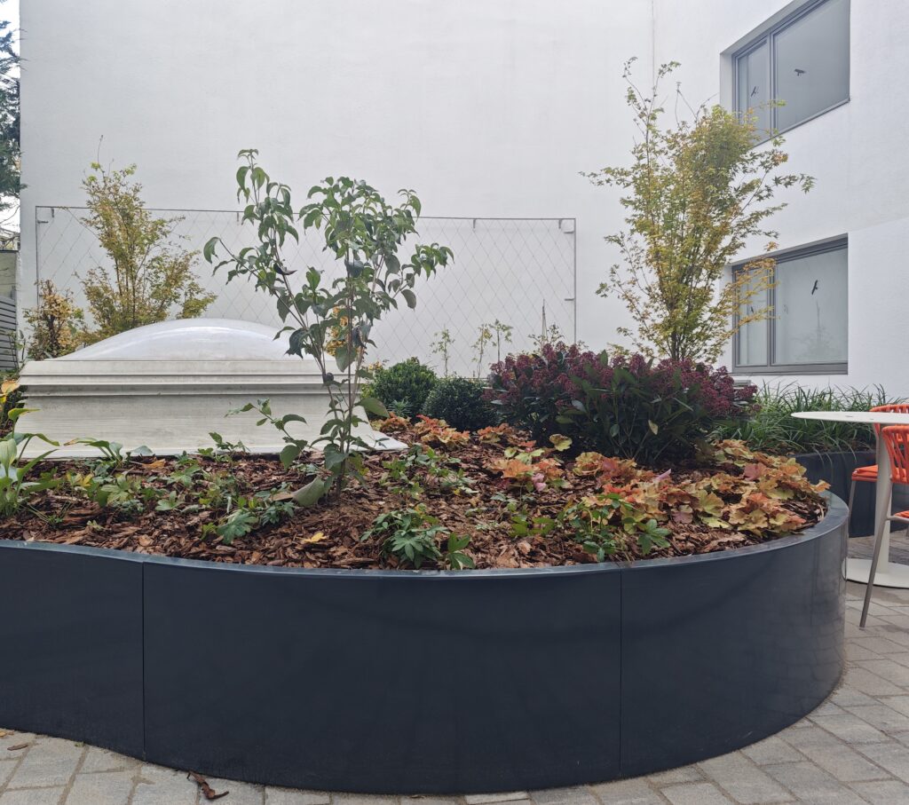 A projekthez használt Line támfal rendszer egy sokoldalúan alkalmazható megoldás, amely ideális zöldtetők, belső udvarok és városi utak környezetének kreatív kialakítására. Az „L” profilú acél fémszegély elemekkel változatos formájú, méretű és magasságú növényszigeteket hozhatunk létre anélkül, hogy a burkolatot meg kellene bontani.