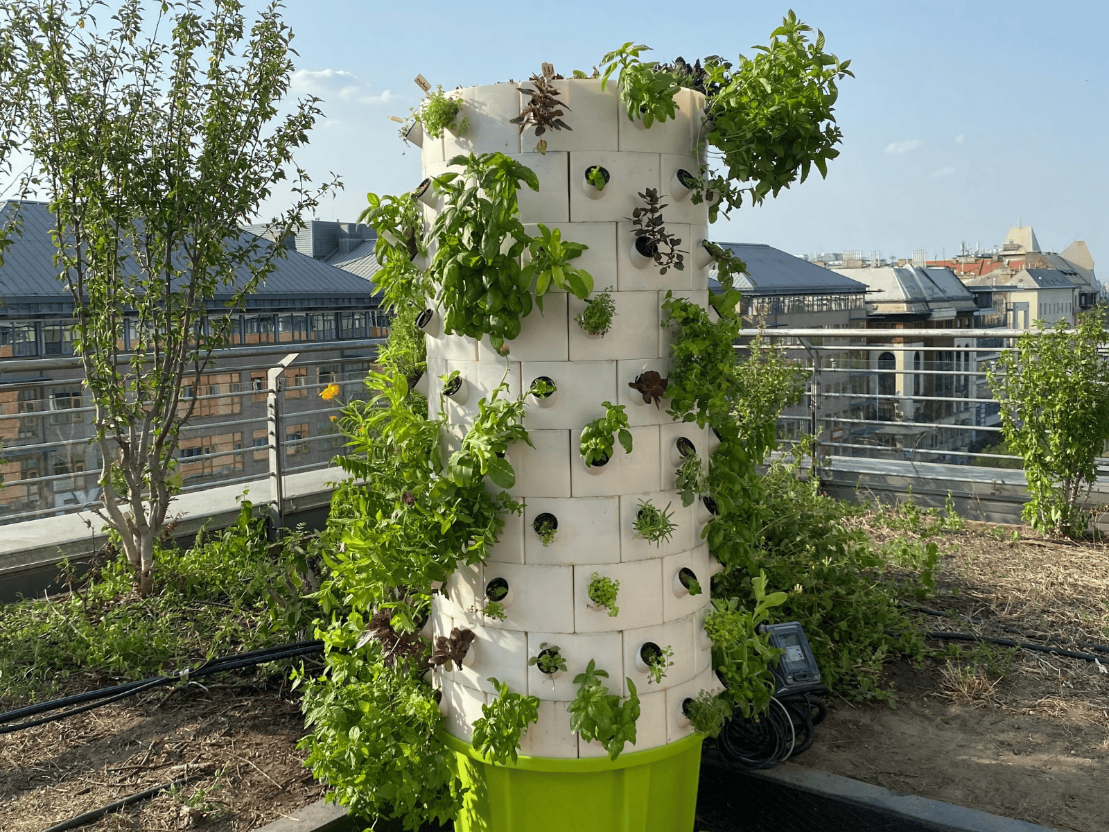 Ez az egyedülálló tetőkert a GreenDrops rendszer használatával készült, amely nemcsak helytakarékos és fenntartható, de esztétikus megoldás is a városi kertészkedéshez. A függőleges növényültetés lehetővé teszi, hogy kis helyen is gazdag növényvilág jöhessen létre, miközben támogatja a biodiverzitást és csökkenti a városi hőszigethatást.